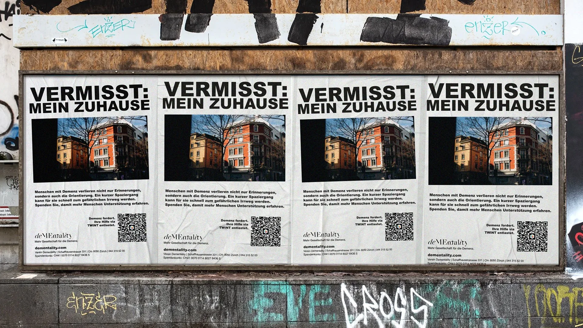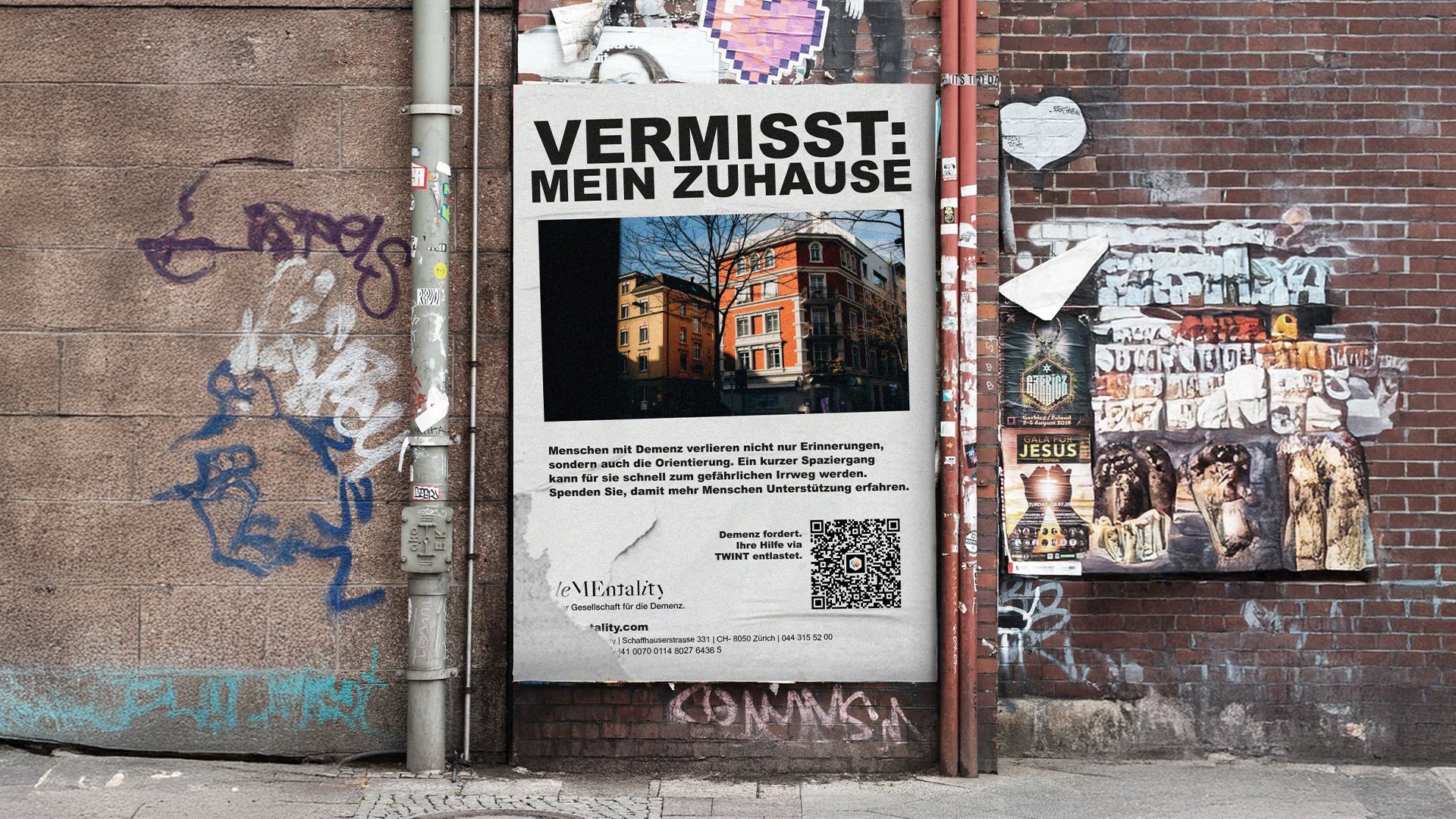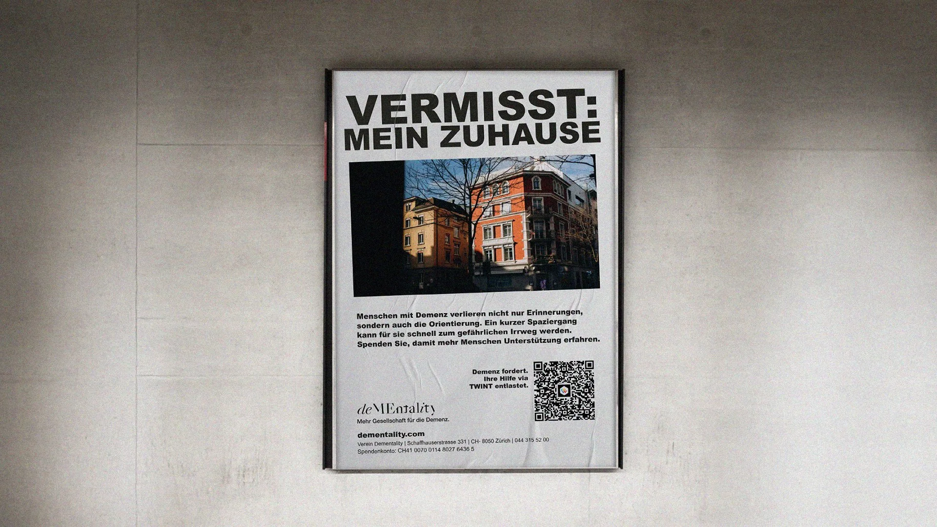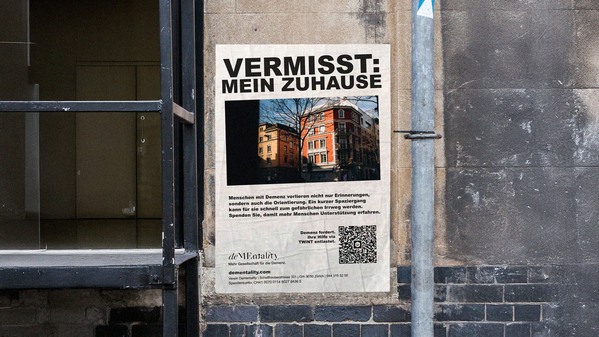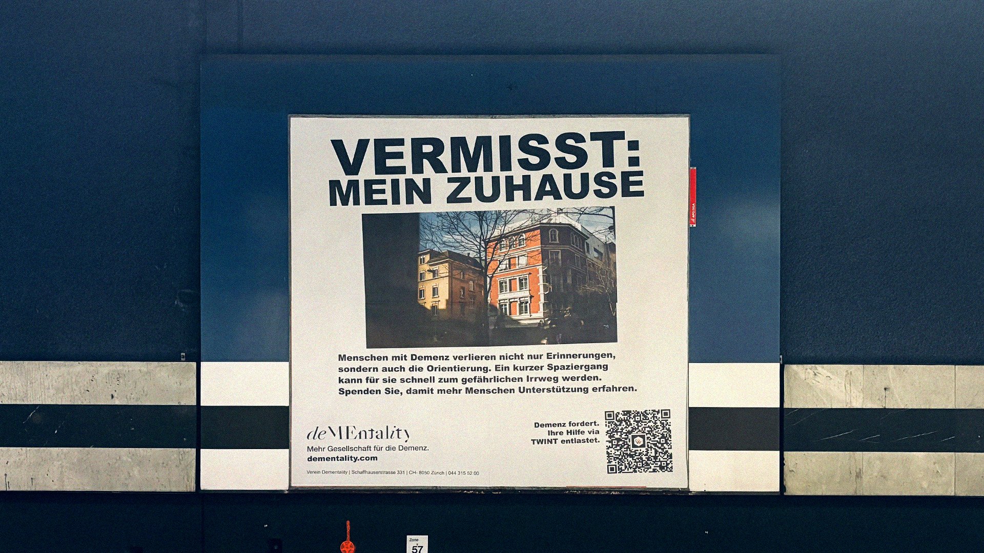 Die visuelle Anlehnung an eine Vermisstenanzeige macht den Verlust von Orientierung sichtbar und bringt das Thema Demenz dorthin, wo Orientierung von Nöten ist: Auf die Strasse.
