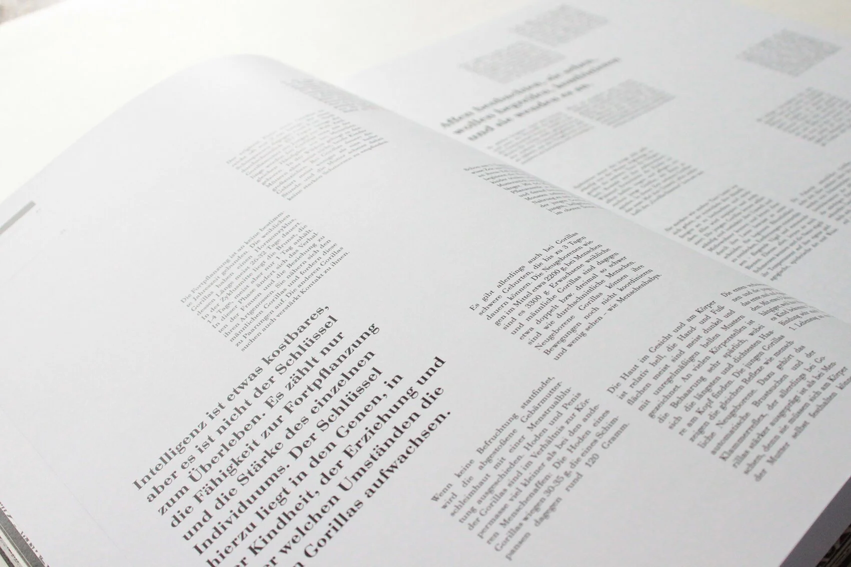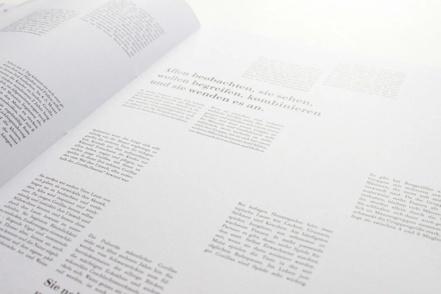 Jede Einheit, jedes Teilchen und jedes Wesen hat seinen Grund und unterliegt einer bestimmten Kausalität. In dieser experimentellen Publikation wurde das Wesen und die Psyche des Gorillas untersucht, grafisch und illustrativ dargestellt und anhand von Querverweisen erläutert. Das Ergebnis ist eine Psychoanalyse, die das Leben und die Bedeutung des Gorillas für sich und seine Gruppe von der Geburt bis zum Tod aufzeigt.